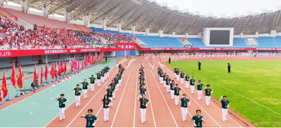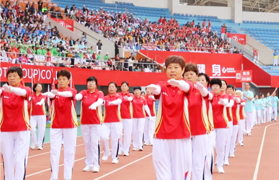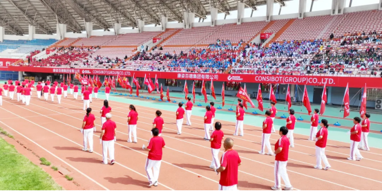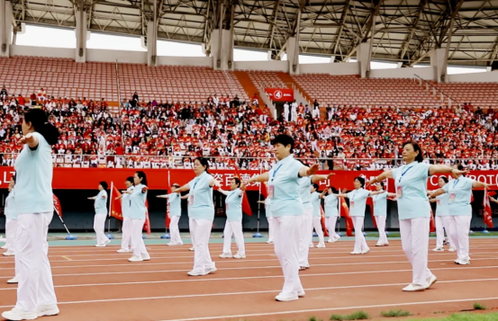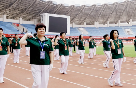 现场82支展演队伍,浩浩荡荡、首尾相连,偌大的体育场瞬时变成一个律动的海洋。参赛队员各个精神抖擞、热情高涨,踏着康姿百德健身操音乐节拍,整齐划一地舞动起来,赢得了全场观众的阵阵掌声。